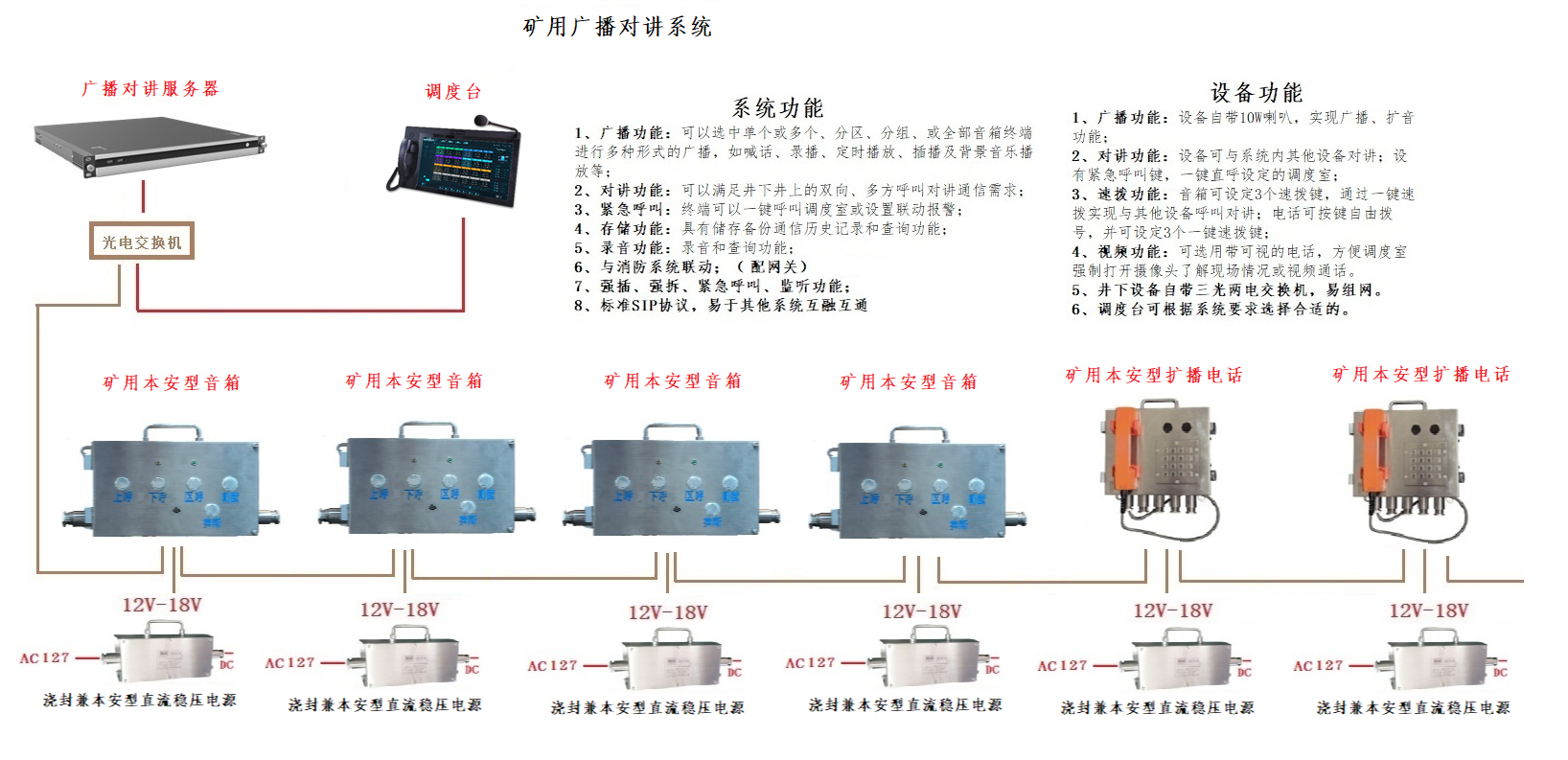 矿用应急广播系统,由广播服务器、调度台或主控台、交换机、本安型音箱和扩播电话等广播对讲终端组成,实现广播、对讲、调度、录音等功能,满足非煤矿山和矿山的复工复产所需应急广播系统的需求